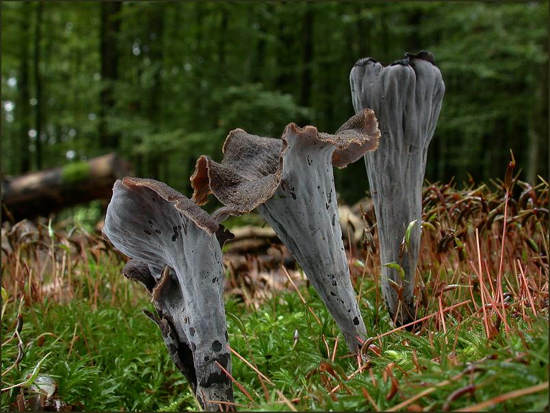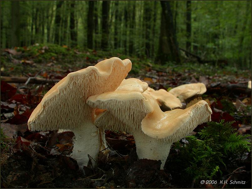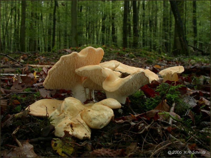Guten Abend liebe Pilzfreunde, in der Pfalz gab es auch Speisepilze, sogar die schon seit Jahren von mir nicht mehr gesehene Herbsttrompete. Desweiteren den Semmelstoppelpilz, Hydnum repandum. Hiervon sollte man nur die jungen Exemplare nehmen, da die älteren bitter werden. Das Alter beim Semmelstoppelpilz ist allerdings nicht an der Größe der Fruchtkörper festzumachen – sondern – an der Länge der Stacheln! Das heißt die hier gezeigten Exemplare sind schon zu alt. Am besten sind sie, wenn die Unterseite nur kurze, noppenförmige Erhebungen aufweist. Viele Grüße