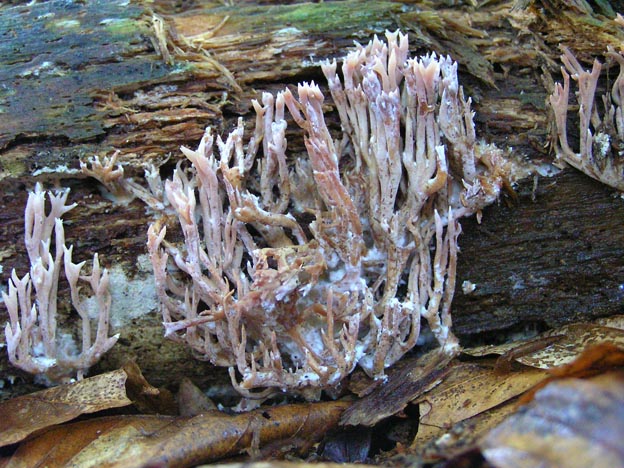 Doch, Dirk, es ist eine Becher-Koralle. Sie wächst auf Holz! Sie ist elastisch und bräunt beim Reiben. Das Sporenpulver ist weiß, der Geschmack nach längerem Kauen scharf. Die abgestuzten und und oft krönchenartigen Spitzen sind mit der Lupe sehr gut zu erkennen. Hier ist noch ein anderes Foto. Ich habe insgesammt drei verschiedene an nahegelegenen Holzstücken gefunden.