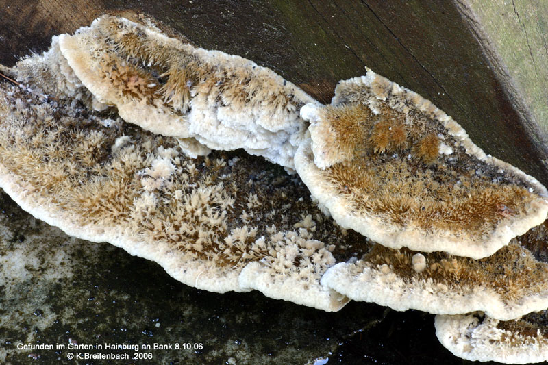 Unbestimmter Fruchtkörper an Fuss von Gartentisch.