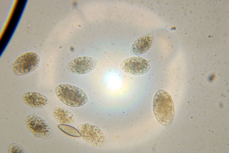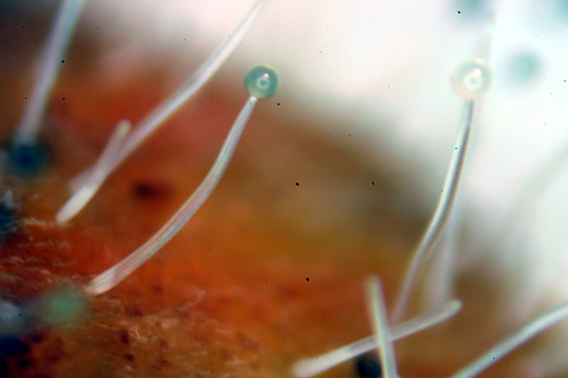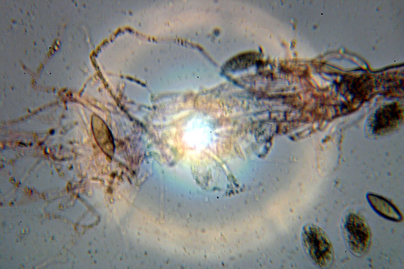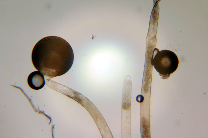 Die Sporen entwickeln sich in dem runden Körper, der bei Reife (oder wenn er unter dem Glasplättchen