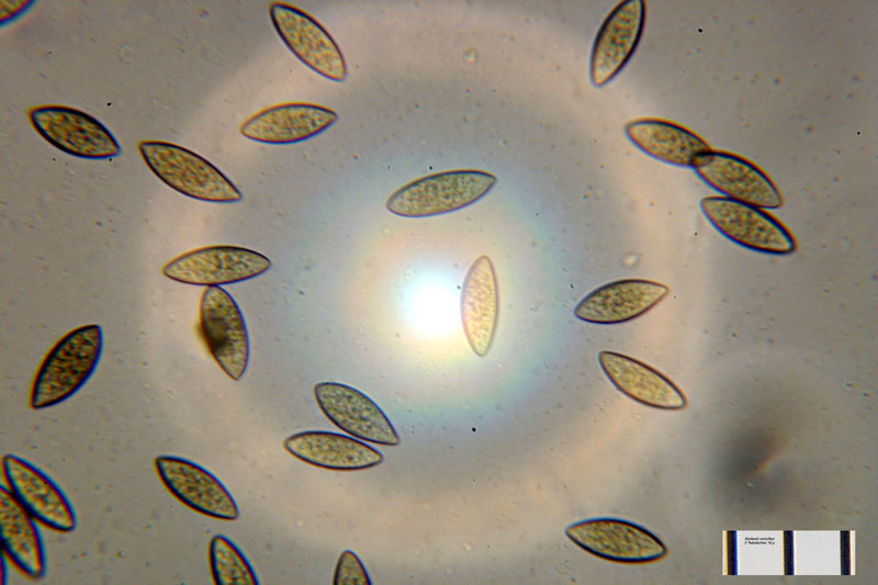 So sehen die Sporen aus, dickwandig, symmetrisch mit den Abmessungen (Sporen sind vermutlich