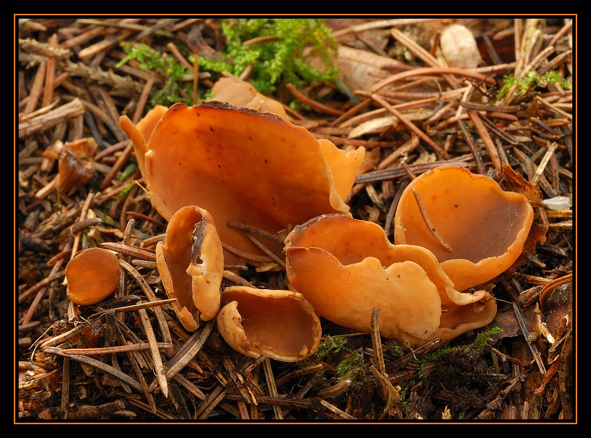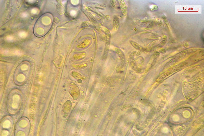 Rudi hat ihn als Nadelwald-Öhrling Otidea abietina angesprochen. Das erschien in vieler Hinsicht plausibel und ich habe ihn eigentlich nur zu Dokumentationszwecken unters Mikroskop gelegt. Die fädigen Paraphysen kommen auch (ungefähr) hin.
