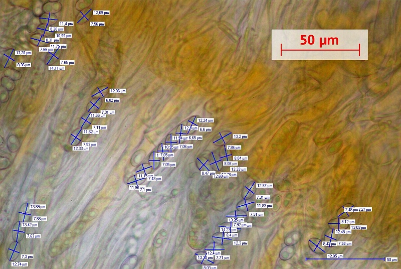 Unser Öhrling hat Sporenabmessungen: (11 -) 12,5 (-14,2) x (6,6-) 7,6 (-8,5) µm. O. abietina aber wird BK 1,59 mit 17,5 - 20 x 9,5 - 10 µm angegeben (noch krasser in den NordMacrMyc 1,108 unter O. propinquata mit 16 - 20 x 9 - 11 µm). Wenn ich dem Otidea-Schlüssel NMM 1,108 folge, komme ich ziemlich schnell und ziemlich eindeutig bei O. leporina, dem Hasen-Öhrling, heraus (allenfalls mit der Alternative O. myosotis). Die Habitat/Substrat-Beschreibung passt: "Among mosses in coniferous forests; autumn". Aber ich habe zu wenig verifizierbare Belege; lediglich Enderle erwähnt den Hasen-Öhrling (S.88) mit knappen Funddaten. Was sagen die Experten? Gruß