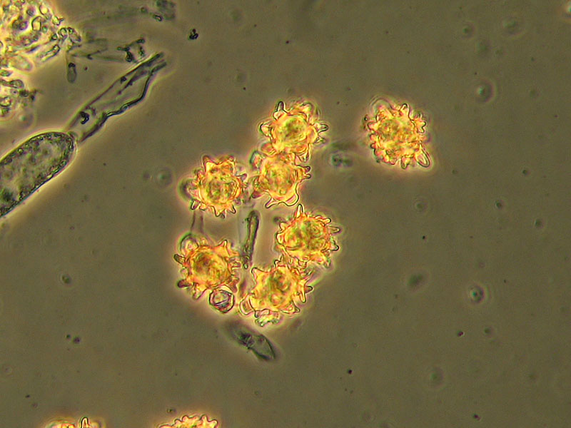 Und noch unten ein Ausschnitt aus einem Foto der Sporen von Nyctalis asterophora - Stäubendem Zwitterling. Es war mit einem 40x Objektiv am Miktoskop gemacht worden und ich behaupte mal, die Ornamentierung der Sporen ist hier ziemlich gut zu sehen.