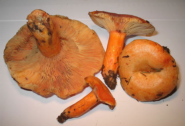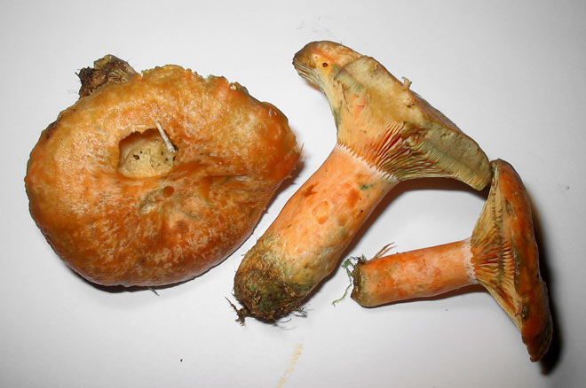 Hallo Freunde der Rotmilchenden, Ich habe nochmal Bilder gemacht. Es sind die von Jochen gezeigten, einige Stunden später. Ich habe versucht die Verfärbung der Milch (frisch/heut Nachmittag) gut darzustellen. Lachs-Reizker - L.salmonicolor Kleiner FK mit frischem Schnitt - orange Milch