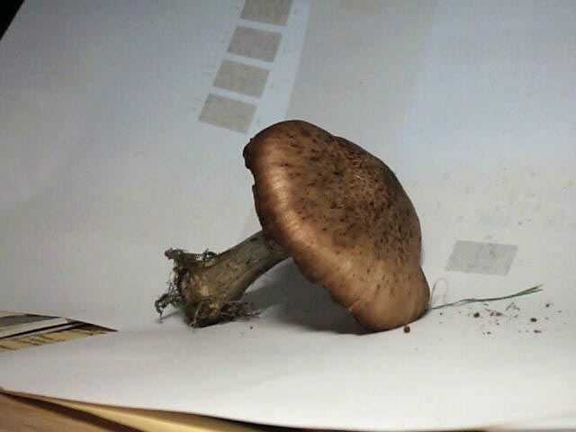 Lamellen weiß (mehr oder weniger) die Schneiden braun, wellig, unregelmäßig. (waren da Viecher dran?)Lamellen laufen im Bogen herab bis zu einem lappigen Ring. Im Stielbereich jedoch nur noch als Rillen, dunkelbraun.Unterhalb silbrig-weiß, (gestiefelt?). Siel wattig (und madig)