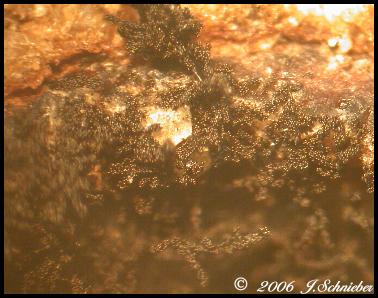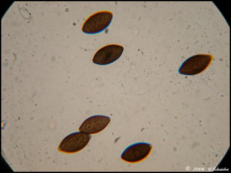 Bei dem Borstling ist es wohl so, das im Inneren jetzt so ein dunkles Gekrüsel zu sehen ist, das anscheinend nur aus diesen dunklen Sporen besteht. Also wohl ein Befall unbekannter Art auf noch unbekanntem Pilz.