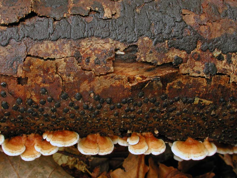 welche 3 Pilzarten reihen sich an diesem Ast so wohlgeordnet auf ?