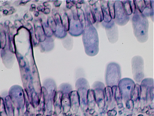 Von den Mikroskop-Offerten der Billigheimer war hier, wenn ich mich recht entsinne, schon verschiedentlich die Rede. Bei Aldi Süd ist derzeit wieder so ein Ding im Angebot, für 49,99 Öre. Nun will ich mir partout kein neues Mikroskop kaufen. Aber die USB-Kamera hat mich interessiert. Einfach so zum Aufstecken, mit - per Datenstream - ständiger Kontrolle vom Laptop aus. Das wär' doch eigentlich ein günstiger Weg zur Mikrofotografie, dacht ich mir. Und hab mir so ein Ding besorgt. Das Mikroskop und den Zierrat drum herum (inkl. "Mikrotom") habe ich gleich beiseitegelegt. Von der CD den Treiber installiert (ohne die Grafik-Software, die muss man nicht haben), Okular raus, Aldi-Kamera rein (dürfte bei den meisten Mikroskopen passen, da 23,2 mm Standardmaß). Und schon geht's los. Naja: beinahe. Erst noch Bildbearbeitungssoftware starten (ich habe Corel PhotoPaint benutzt, jede andere tut's auch), die Kamera als Quelle auswählen und "Bild holen" anklicken. Dann geht das Treiberfensterchen auf und man sieht ein zappeliges Bildchen. Dem Zappeln kann man relativ einfach abhelfen: Der Treiber ist auf die US-amerikanischen 60 Hertz Netzfrequenz eingestellt. Bei 50 Hertz ist Ruhe. Aber alles ist unscharf. Parfokalität von Okular und Kamera ist also nicht. Macht aber nix. Man kann ja am Monitor wunderbar verfolgen, wanns scharf ist. Zum Testen habe ich ein Dauerpräparat von Heinz Clemencon genommen (6 µ stark übrigens): Coprinopsis sclerotiorum (für Traditionsverbundene gerne auch Coprinus sc.) Ein Querschnitt durch den Hut eines unreifen Basidioms (übrigens ein Fund von Peter Karasch). Als Mikroobjektiv kam ein NoName-40er-Planobjektiv zum Einsatz. Und jetzt nur noch "snap" anklicken, schon ist das erste Bild im Kasten. Das Kameraobjektiv/Projektiv hat offenbar eine starke Vergrößerung. Denn gesehen habe ich nur das: