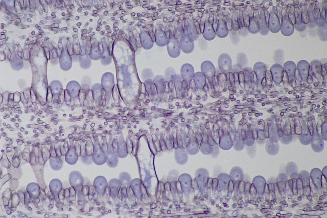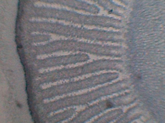 Eigentlich hatte ich ja nicht zum Mikroskopkauf geraten, sondern bloß zum Kauf des Fotookulars (das es halt nur mit dem Mikroskop zu 49,90 gibt). Auf vielfachen Wunsch eines einzelnen Herrn habe ich jetzt das Präparat spaßeshalber auch mal unter das Originalmikroskop gelegt. Da kann man nur sagen: Finger weg. Grausig! Das Ding hat 3 Objektive (4x/10x/40x), und mit dem 40er kann man nicht scharfstellen (durchs normale Okular), weil das Objektiv vorher auf dem Deckglas aufsitzt. Fotografieren kann man damit, aber es lohnt sich wirklich nicht, weil es schlicht an allem hapert. Beispiel 1: 4x-Objektiv: