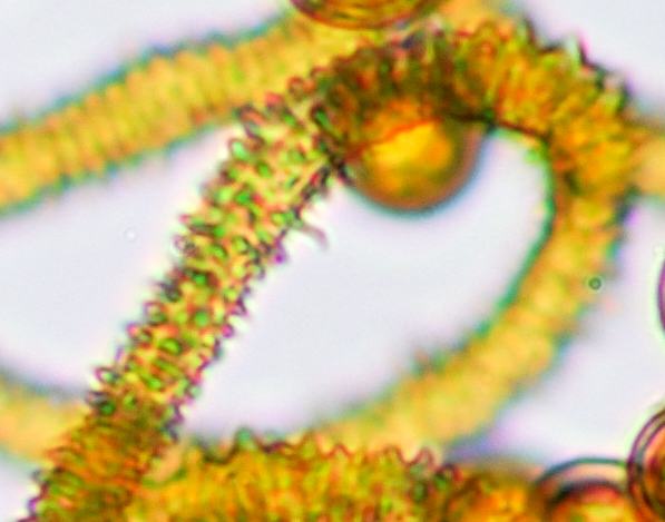 Hallo Andreas, dass ich mir nicht zu hundert Prozent sicher bin, habe ich ja angedeutet. Aber so ganz aus der Hüfte geschossen habe ich meinen Vorschlag auch wieder nicht. Die Zweifel, die Du vorträgst, glaube ich jedenfalls ganz leicht zerstreuen zu können. : Für mich sind das Spiralleisten, keine isolierten Stacheln. Da ist, denke ich, wenig Raum für Interpretation. Unverkleinert sieht die Aufnahme so aus: