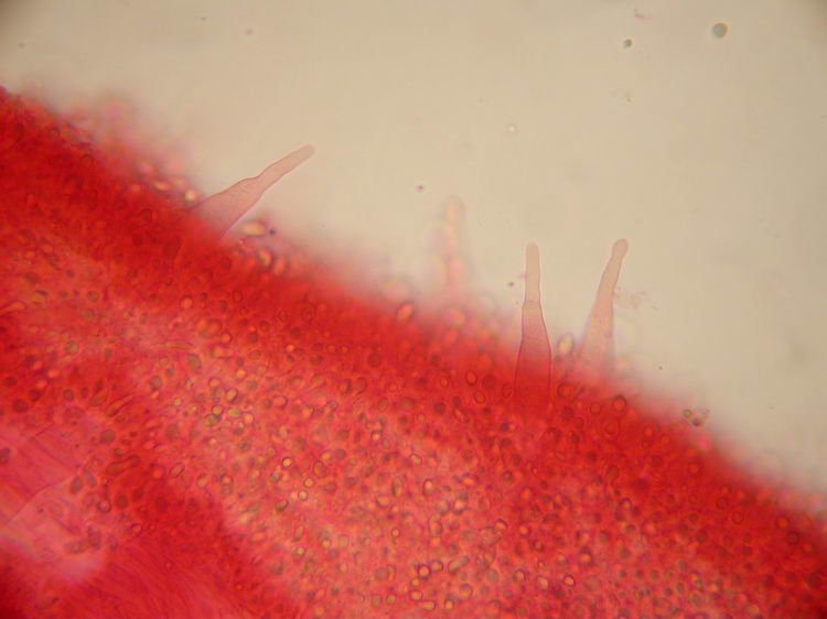 Funddaten: 26.10.2006; MTB 8235/4/2/2, 860 m, Marienstein, Schafweide; auf der Wiese bei großen Tannen und Fichtenbabies; gesellig (ca. 5 Fk); Hut: 3-4,5 cm breit, jung kegelig, später ausgebreitet, mit kleinem, warzenförmigem Buckel, leicht schmierig und glänzend, hygrophan, beim Abtrocknen fast zu 2/3 durchscheinend gerieft, alt auch fein radialrinnig, Oberfläche feinsamtig, schockoladenbraun, beim Abtrocknen radial ausblassend, Hutrand bisweilen ebenmäßig, aber auch leicht wellig oder angedeutet gelappt; Stiel: bis 6 cm lang, bis 0,7 cm breit, zylindrisch, bisweilen tief gefurcht (wie ein Saftling), glatt, bisweilen weißlich überfasert, vor allem apikal schwach bereift, graubraun mit deutlichem Olivton, bisweilen auf ganzer Länge mit kleinen braunen Pünktchen besetzt, Basis kaum verdickt und ohne Myzelfilz; Lamellen: schmal angeheftet, fast frei wirkend, bauchig, mäßig gedrängt, untermischt, hellgrau, alt graubraun, Schneiden heller grauweiß; Fleisch: dünnfleischig, wässerig graubraun bis dunkelbraun; Geruch: unauffällig; Geschmack: unangenehm ranzig; Lamellentrama: -; Basidien: 2-sporig (bei einem Fruchtkörper), 3-4-sprorig (bei zwei anderen Fk);; Cheilozystiden: siehe Pleuros; Pleurozystiden: spindelig, z.B. 90x15, 88x14; Kaulozystiden: (im oberen Stieldrittel): keulig bis zylindrisch, büschelig, z.B. 33x7, 22x6, 27x5, 22x6; mit großen Schnallen; HDS: Cutis, oberste Schicht aus 2-5 µm breiten Zellen, Endzellen bisweilen schwach keulig und bis ca. 7 µm breit, mit großen Schnallen; Sporen: beim 3-4sporigen Fk: 7,7 x 5,2 (7-8 x 4,5-6,5) Q=1,47 (1,2-1,6)