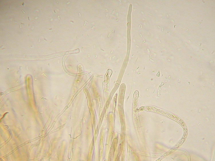 Funddaten: 21.01.2006; MTB: 8034/2/2/3; Isarauen Schäftlarn; auf abgestorbenem, noch stehendem Erlenstamm; büschelig-dachziegelartig; Hut: 4-5 cm breit, muschelförmig, Rand durchscheinend fein gerieft; Oberfläche speckig, klebrig; haselnuss- bis kastanienbraun, hygrophan, stellenweise ockerbräunlich ausgeblasst; Stiel: seitlich gestielt, Stiel kurz, kräftig und zäh, auf der Unterseite gegenüber den Lamellen dunkler gelbbraun kontrastierend, Stiele wie beim Austernseitling verwachsen; Lamellen: schwach ausgebuchtet angewachsen, dünn, dichtstehend, untermischt, Schneiden glatt, dunkelbraun flockig, blass hellbraun, wässrig; Fleisch: creme bis blassbräunlich, zäh und sehr wässrig; Geruch: unauffällig pilzig; Geschmack: mild, neutral; Lamellentrama: irregulär, Hyphen mit Schnallen; Basidien: 4-sporig; Cheilozystiden: massenhaft, keulig, teil körnig pigmentiert, mit Schnallen, 25-35 x 7-10; Pleurozystiden: spärlich, keulig, mit homogenem gelblichem Inhalt, 50-55 x 15; HDS: Trichoderm mit zylindrischen bis keuligen, langen Endzellen, die teils körnig, teils homogen intrazellulär gelbbraun pigmentiert sind; Sporen: gekrümmt zylindrisch (allantoid), hyalin, glatt; 3,5-5,5 x 1-2; Gruß aus München