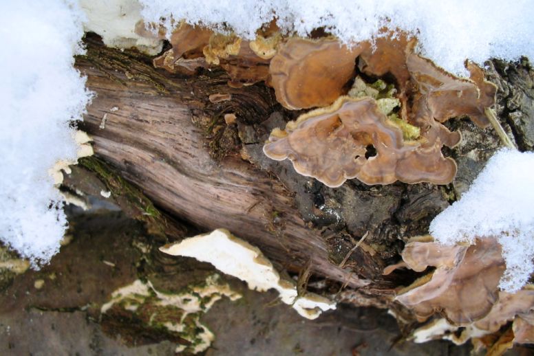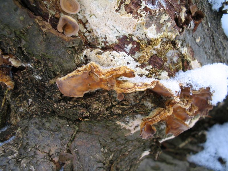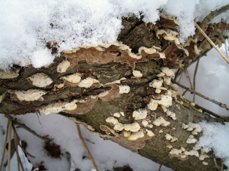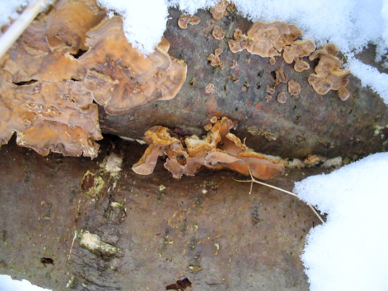 Durch den hohen Schnee gelaufen, fand ich dann an umgestürzten Ästen und Stämmen von Buche doch noch was, was ein Pilz sein könnte: