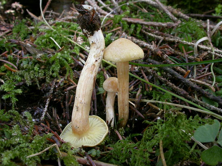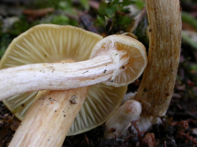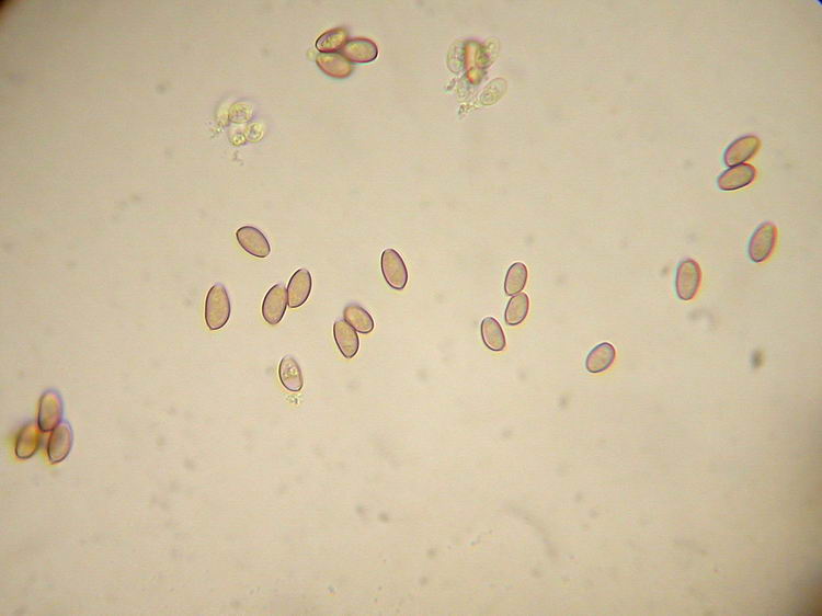 Funddaten: 01.04.2006; Taubenberg im Fichtenwald; auf vergrabenem Fichtenholz; Hut: 2-2,5 cm breit, gewölbt mit stumpfem Buckel, trocken, gelb bis ockergelb, mit silbrig glänzenden Velumresten, Hutrand etwas nach innen gebogen, glatt bis leicht wellig, jung durch Cortinareste mit dem Stiel verbunden; Stiel: 5-6 cm lang, bis 0,8 cm dick, zylindrisch, voll, stellenweise hohl, verbogen, hutfarben, stark längsfaserig, stellenweise bräunend, mit vergänglicher Ringzone, Basis höchstens schwach verdickt, bisweilen gekniet; Lamellen: stark ausgebuchtet angewachsen, olivgelb, Schneiden schwach wellig und alt bisweilen rostfleckig; Fleisch: trocken weiß, frisch gelblich durchnässt, im Stiel zur Basis hin mehr und mehr braun bis rotbraun; Geruch: angenehm pilzig; Geschmack: mild, +/-neutral; Lamellentrama: regulär, Hyphen mit Schnallen; Basidien: 4-sporig; Cheilozystiden: zylindrisch bis plump keulig mit relativ dicker Anwachsstelle, bisweilen mit Fortsatz, 19-30 x 8-10; Pleurozystiden: keine beobachtet; HDS: aus dicken (10-20), ca. 40-50 langen Zellen; Sporen: elliptisch, mit KP, dickwandig, 7,6 x 4,3 (7-9 x 4-5), Q=1,76 (1,6-2); Sporenpulver: dunkelbraun; Gruß aus München