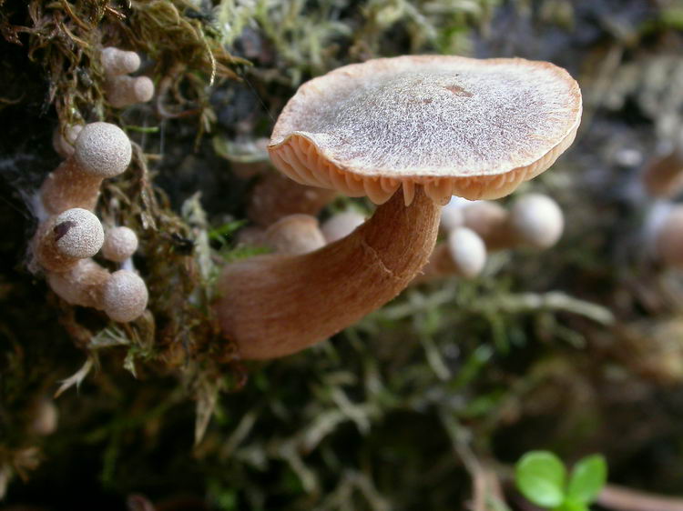 wem fällt was zu diesen Winzlingen ein, die auf der Rinde eines liegenden Buchenastes wuchsen? Ich habe schon an Simocybe und Tubaria gedacht, aber es will nichts so recht passen.