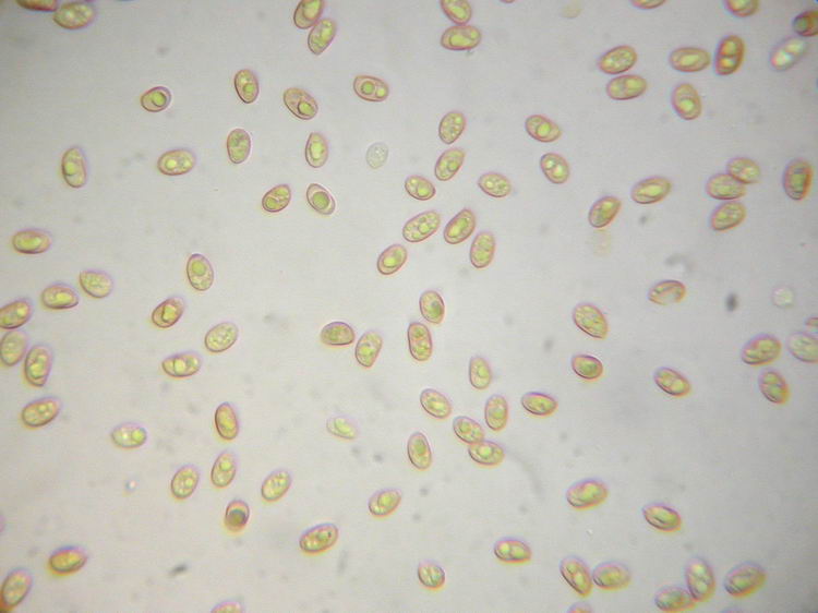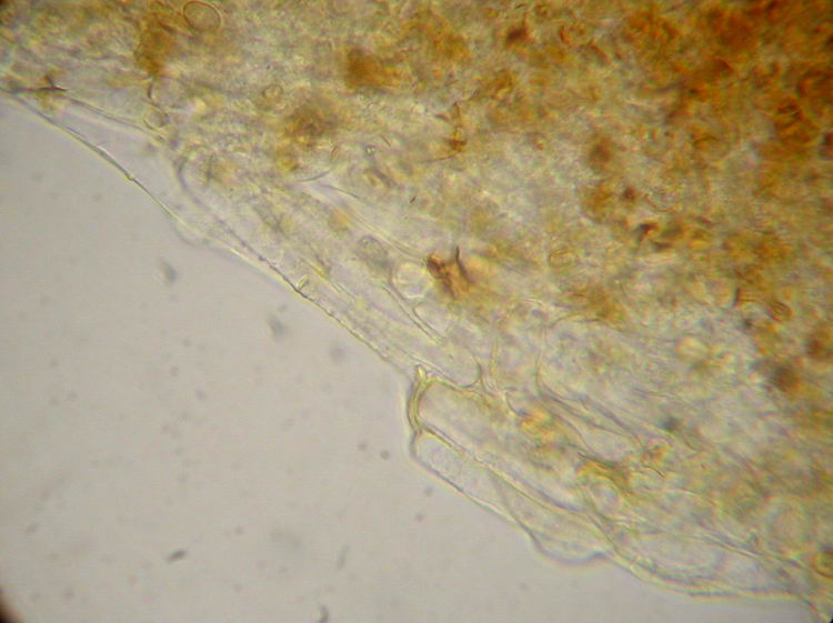 Funddaten: 02.04.2006; Forstenrieder Wald bei München; büschelig auf liegendem Buchenast, auf der Borke wurzelnd; Hut: 1-1,5 cm breit, ohne Buckel, feinfilzig, blassbräunlich und fein silbrig überhaucht (Velum), Rand jung mit Velumresten behangen; Stiel: bis 2 cm lang, bis 0,5 cm dick, hutfarben, längsfaserig, mit vergänglicher Ringzone (Fruchtkörper jung komplett vom Velum verhüllt), an der Basis keulig verdickt und stark weißfilzig; Lamellen: mäßig gedrängt, stark untermischt, gerade angewachsen, zimtbraun; Fleisch: blassbräunlich, in der Stielbasis weißlich; Geruch: angenehm pilzig; Geschmack: mild, +/-neutral; Lamellentrama: regulär; Basidien: 4-sporig; Cheilozystiden: zylindrisch, meist kopfig oder schwach keulig; Pleurozystiden: keine beobachtet; HDS: aus parallel liegenden, gelbliche inkrustierten Hyphen, 5-10 µ breit, Septen mit Schnallen; Sporen: elliptisch, ohne KP, mit zahlreichen Tropfen, dickwandig, J-, 7,2 x 4,6 (6-9 x 4-5), Q=1,6 (1,4-1,8); Sporenpulver: hell olivbraun;