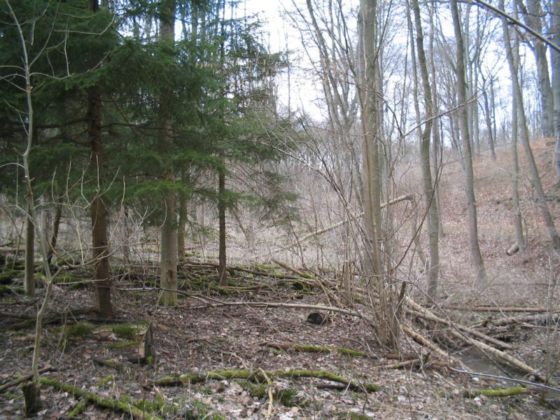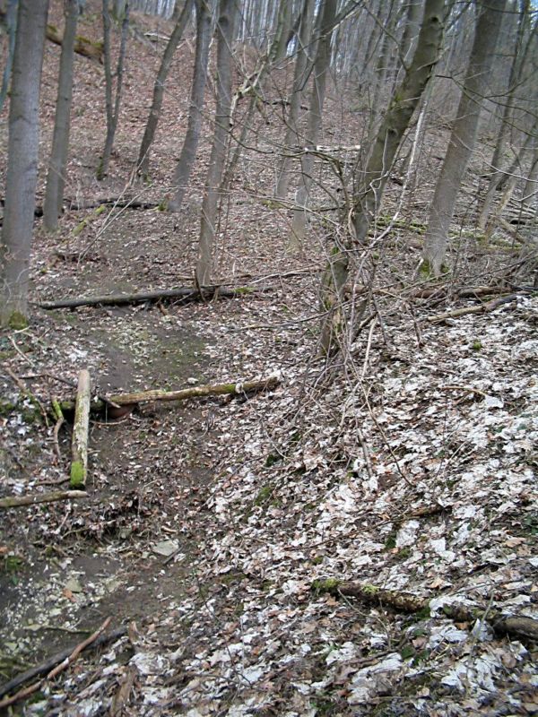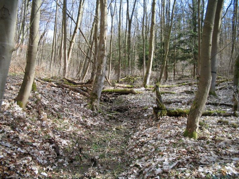 Laubwald mit Eschen, Eiche, Pappel, Holunder und Buche sowie eingestreuten Fichten und einer Erosions-Rinne. Um diese ist es immer sehr feucht und "Grüner" als der Rest des Waldes.