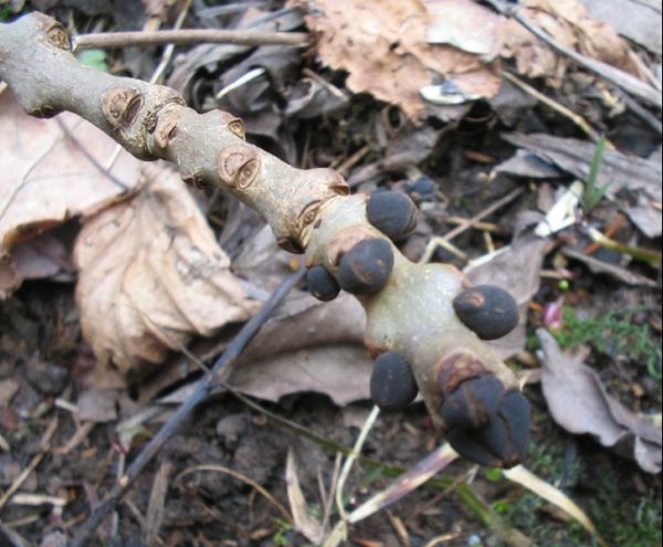 Entlang der Rinne auf den durch das Schmelzwasser mitgerissenen größeren Äste und Stämme fruktifizieren dann auch die Morchelbecherlinge. Hier noch ein Eschenzweig mit Knospen: