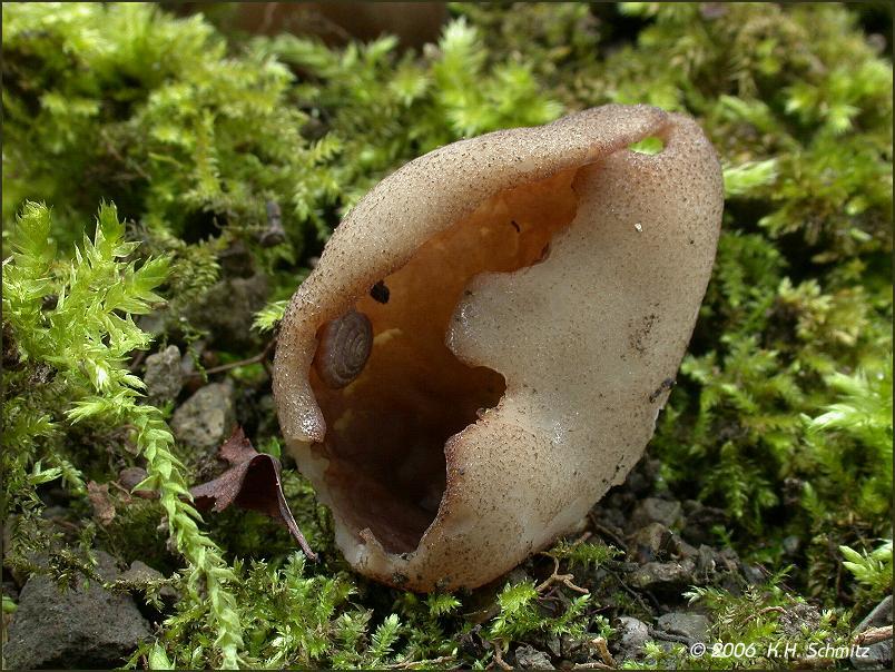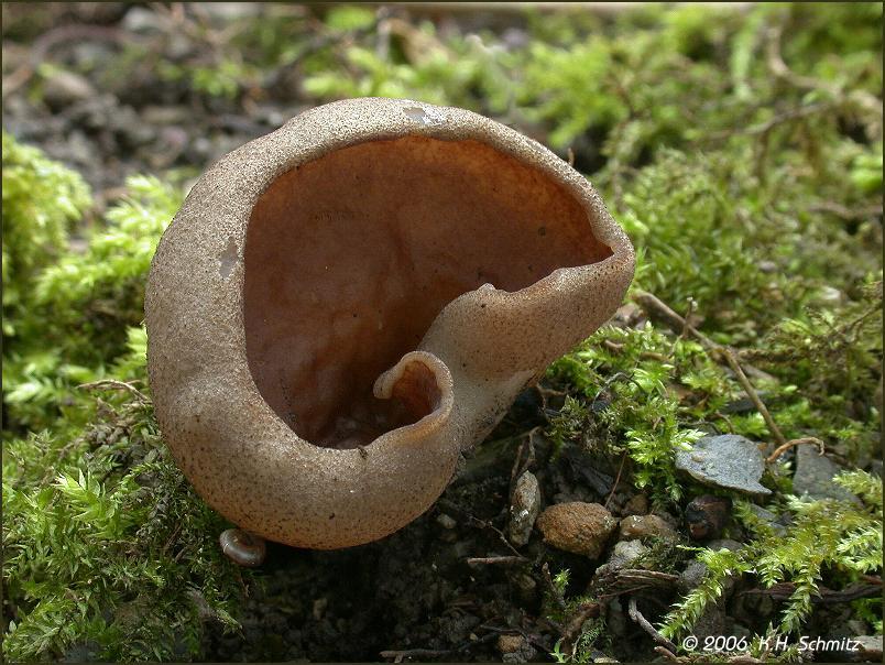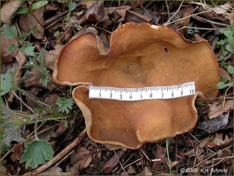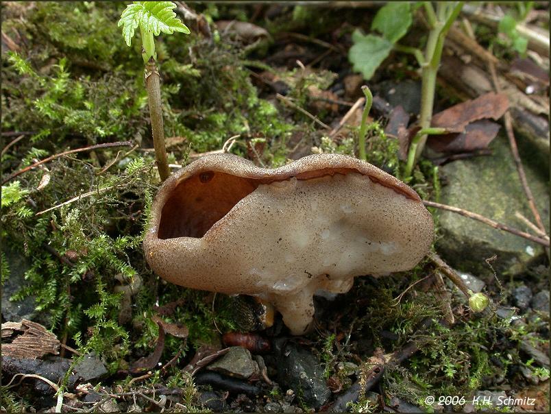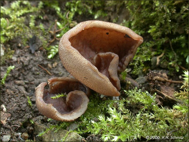 fand Jürgen am 13. April 2005 den Morchel-/Aderbecherling, Disciotis venosa. Hallo liebe Pilzfreunde, Da dieser Pilz für unsere Umgebung eine Rarität darstellt, wollten wir sehen, ob wir ihn wieder an dieser Stelle vorfinden. Am Samstag zogen wir also los. Wir hatten schon fast die Hoffnung aufgegeben, als Marcel (das ist Jürgens Jüngster) der schon einige Meter voraus war, uns zurief. Er hatte kleine Becherlinge gefunden, die allerdings nur wenig nach dem Morchelbecherling aussahen. Eine Geruchsprobe (Chlor/Schwimmbad) bestätigte dann aber doch den von uns erhofften Fund. Die Fruchtkörper waren noch sehr jung nur wenige cm groß. Es können aber große „Schlappen“ werden, wie auf dem letzten Bild, welches im April 2005 entstanden ist, zu sehen ist. Wünsche noch einen schönen Abend Viele Grüße