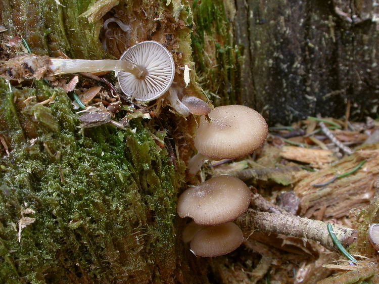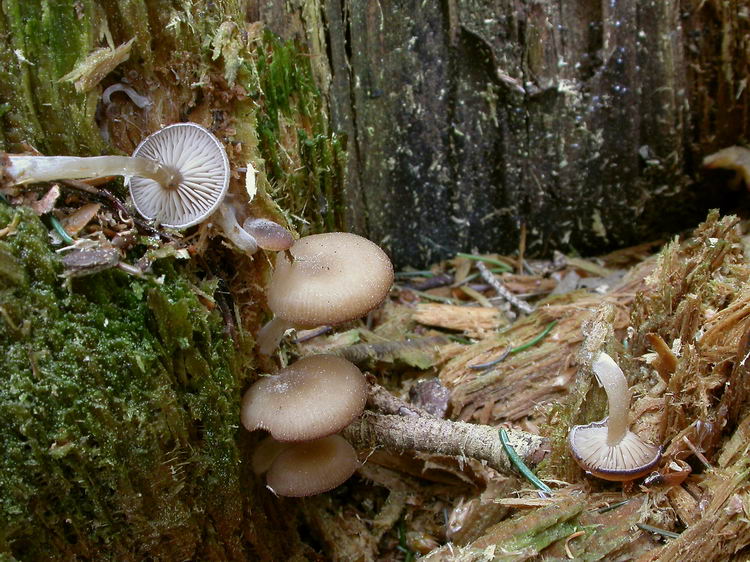 ... soll ich diese in einem Fichtenstrunk gewachsenen Pilze stecken? Mir fällt nix dazu ein. Auffallend sind der muffig-rettichartige Geruch, die nabelingsartig vertieften Hüte und das Vorkommen im Inneren eines alten Fichtenstrunks.