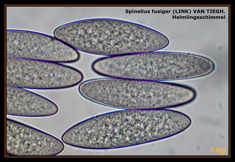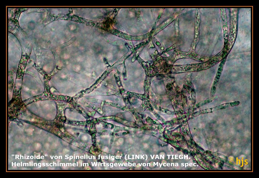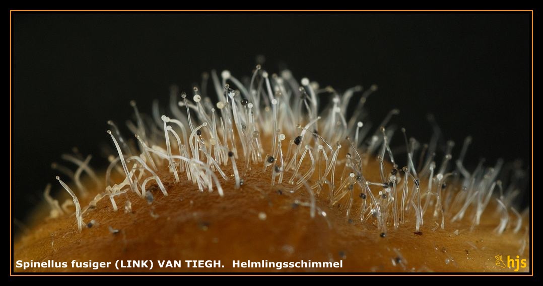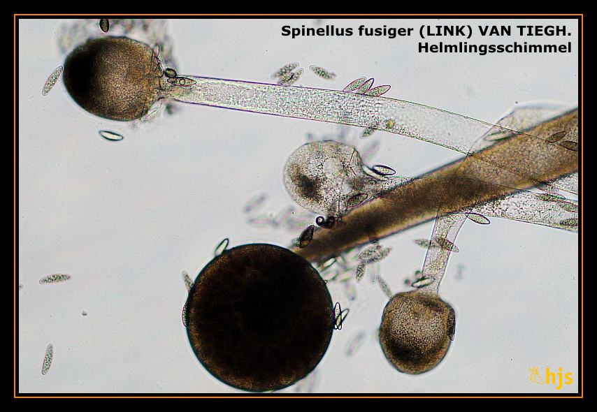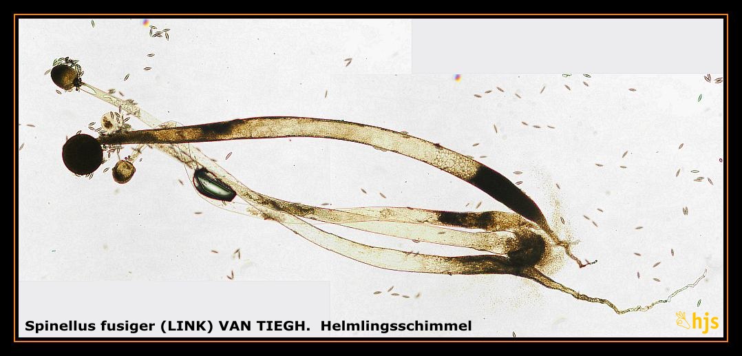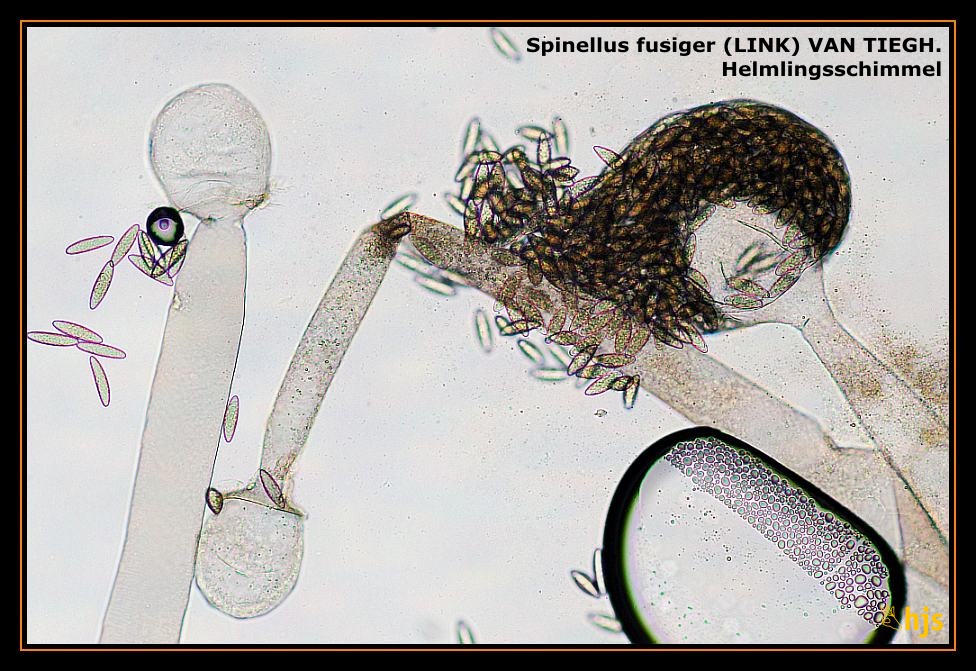 Man erkennt auf diesem aus zwei Einzelaufnahmen zusammengesetzten Bild sehr schön, dass die Sporangiophoren spindelig in dem befallenen Pilz stecken und in einem schmalen Hyphenband auslaufen, das mit dem Zellgewebe verbunden ist, mit dem der Schimmelpilz seinen Wirt durchsetzt. Man erkennt kugelförmige Sporangien in unterschiedlichen Reifestadien. Und man sieht bereits die ersten Sporen.