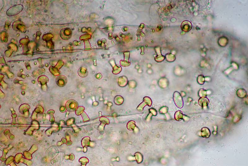 Leider kann ich keine exakte Größenangabe machen, weil ich noch keine Messeinrichtung für mein Mikroskop habe. Grob gesprochen: 400-fache Vergrößerung. Kann mir jemand sagen, was das für eine gurkenartige Struktur mit aufsitzenden Mikrochampignons sein könnte? Danke für jeden Tipp