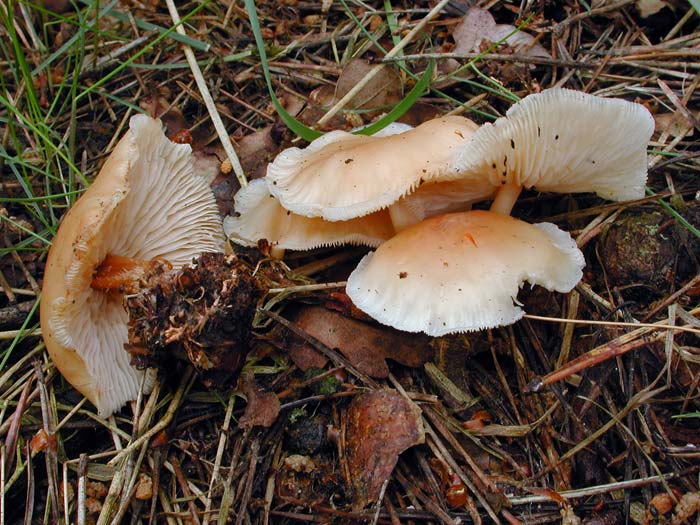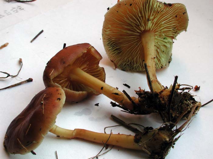 Direkt daneben wuchsen diese Pilze. Eigentlich genauso, aber mit einer Lamellenfarbe