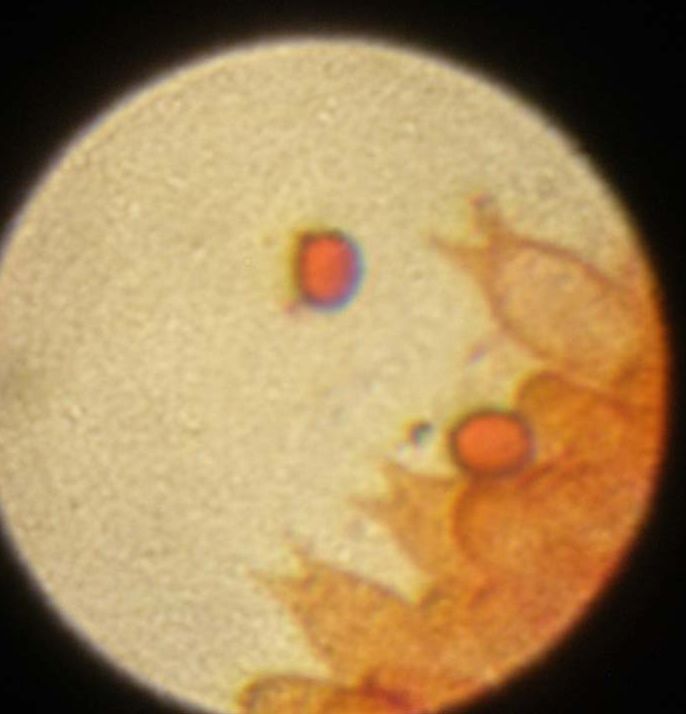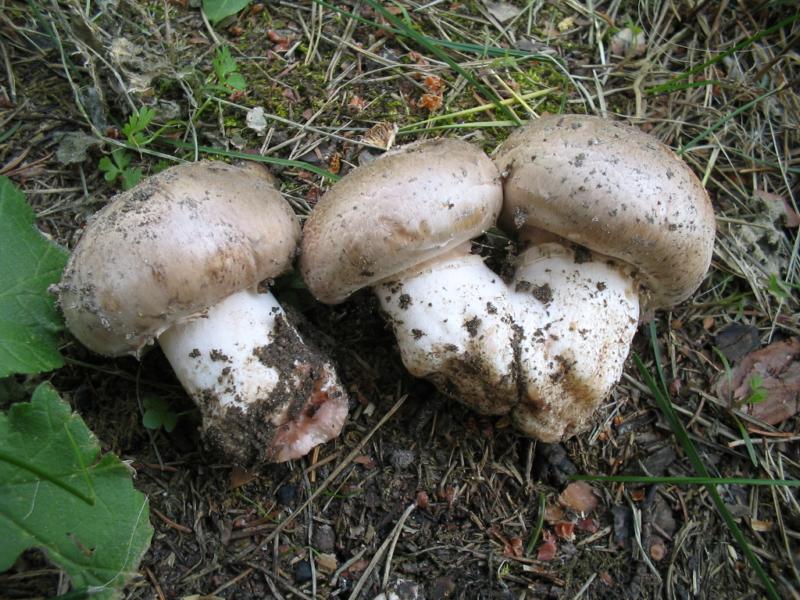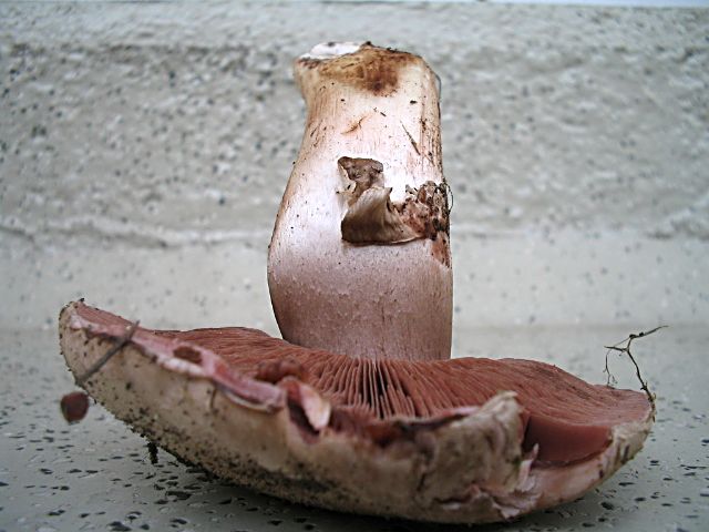 Fleisch im Schnitt je nach alter leicht rot/orange bzw. stark rötend, nach einer Weile verblasst die Verfärbung. Stiel: In der Basis auf Druck bräundend, leicht bauchig. Der Ring macht uns Schwierigkeiten: gestiefelt oder nicht? Vielleicht könnt ihr das anhand der Bilder eindeutiger sagen. Bei größeren Exemplaren verschwindet der Ring so gut wie, es sind nur noch Fetzen vorhanden. Geruch und Geschmack: angenehm wie Stadtegerling (nußartig). Nach Makro und mikroskopischer Bestimmung bleibt festzuhalten: Der Agaricus ähnelt A. subfloccosus aber auch A. bisporus. So richtig passt das aber nicht. Sporengröße 5-8,5 µm.