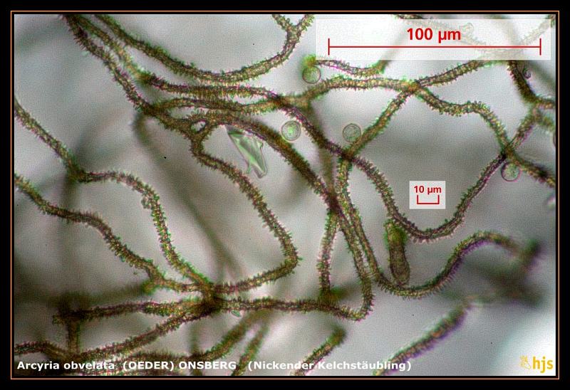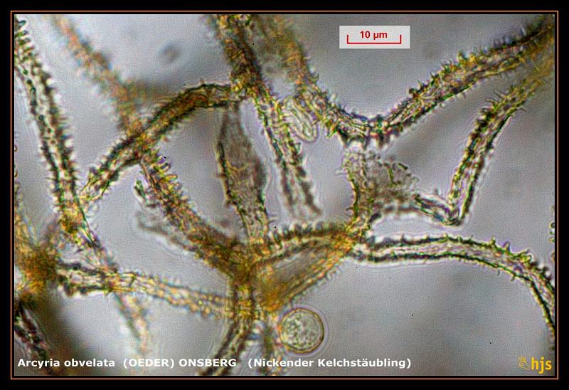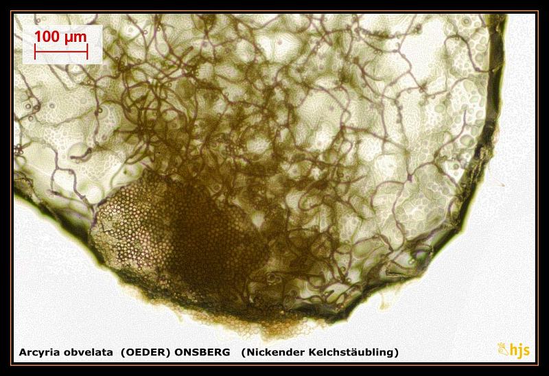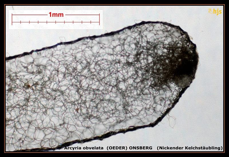 Wenn man genauer hinschaut, erkennt man die netzige Struktur des Capillitiums und einige Sporencluster am Kopfende. Das Capillitium-Geflecht ist äußerst elastisch (im Schlüssel von Neubert, Nowotny & Baumann (1993, 1995, 2000): Die Myxomyceten, Bd. 1-3) das Kennzeichen von Arcyria).