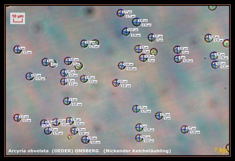 Die Sporen sind rund, mit einem Durchmesser von ca. (8,3-) 9 (-9,8) µm (hier ausgemessen mit Jens Rüdigs Bemaßungsprogramm).