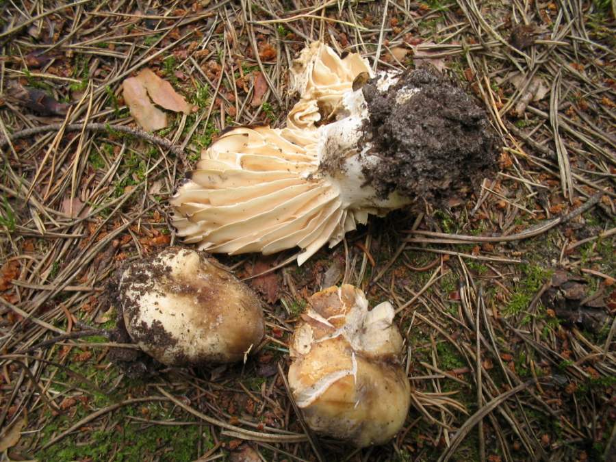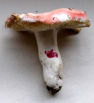 Zuerst dachte ich an R. adusta. Jochen bestimmte ihn dann eindeutig. "...Bei R.antracina sind die pigmentierten Tröpfchen in den Huthauthyphen das alles andere aus dem Feld schlagende Merkmal. So steht es jedenfalls in der Literatur..." Zum Abschluß ein vermeindlich von mir bestimmter Apfeltäubling, auch wenn er so aussieht, und der Standort passt, Russula paludosa fällt u.a. durch den scharfen Geschmack aus. Durch den "inneren Zustand" war keine Bestimmung mehr möglich.