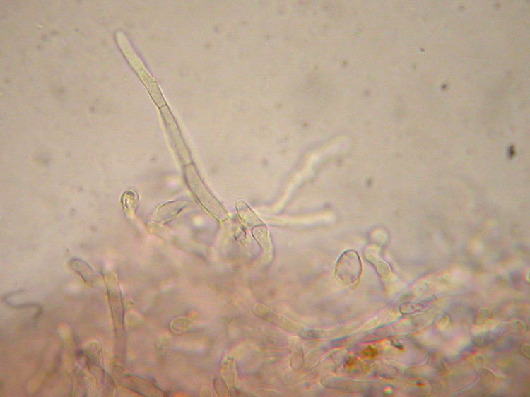 HDS-Hyphen nach Anfärben mit Carbol-Fuchsin und zweimaligem Auswaschen mit HCl (3%), nur am Rand des Präparats zu sehen (???):