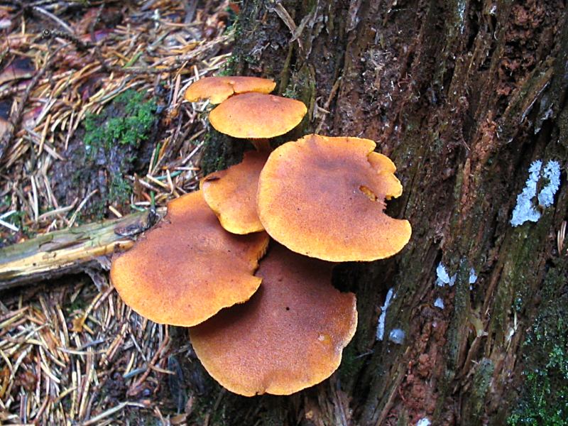 Diese Gesellen kamen ziemlich häufig an Fichten-Stümpfen vor, das Beste was mir dazu einfällt wäre der Geflecktblättrige Flämmling (Gymnopilus penetrans)