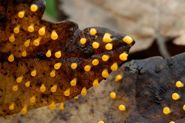 Na, dann hänge ich mich doch gleich an Rudi dran und präsentiere diesen mutmaßlichen Schleimpilz auf Ahornblättern von der Karlburg: