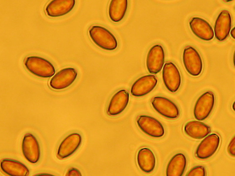 Danke für den Tipp, es ist tatsächlich ein Stropharia aurantiaca - Orangeroter Träuschling - ich habe gerade die Sporen fotografiert und gemessen: 10,9x6,2µm (10,3-11,8 x 6.0-6,5). Wie unten im Bild zu sehen, in Melzer erscheinen die Sporen braun, sind also dextrinoid. Auch Keimporus war auf einigen Sporen gut zu sehen. Die Zystiden habe ich aus Zeitmangel nicht mehr untersucht... Interessant ist die Tatsache, dass ich diese Pilze auf einer Stelle gefunden habe, wo voriges Jahr sehr viele Fruchtkörper des Grünspan-Träuschlings (Stropharia aeruginosa) erschienen.