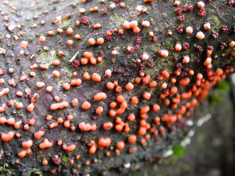 Auf frisch gefallenen Ästen Massen vom Zinnoberroten Pustelpilz
