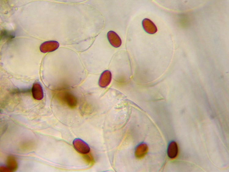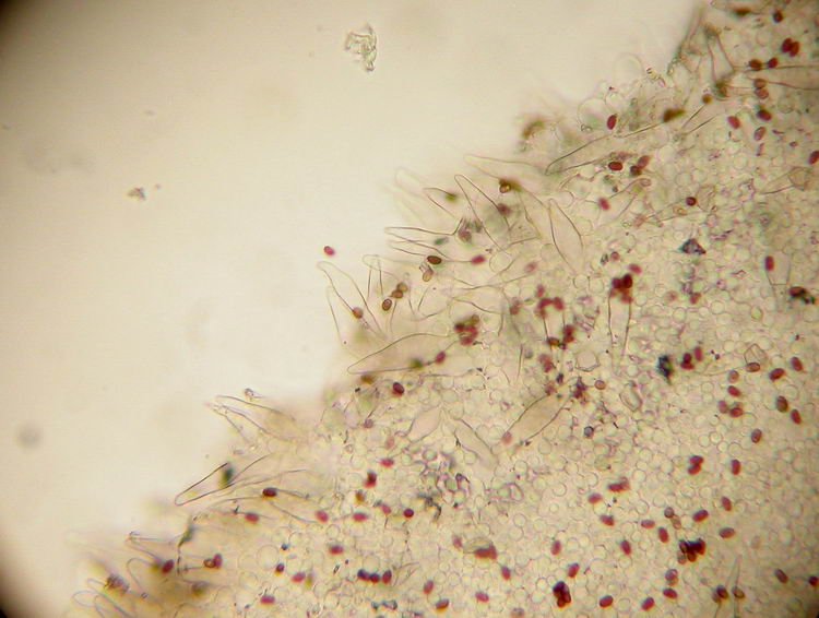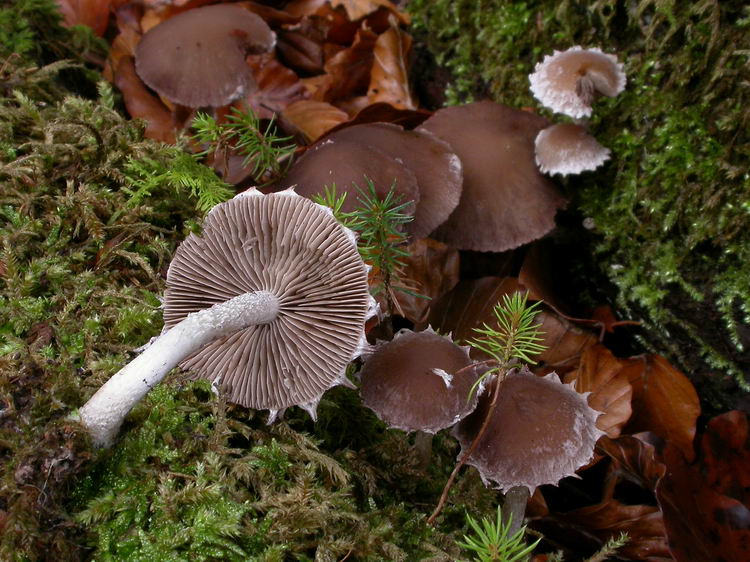 Funddaten: 28.10.2006; MTB 7934/4/1/3, 600 m Oberdill, vorne am Herbsttrompetenhang auf morschem Buchenholz (Stammstücke); gesellig (ca. 10 Fk); Hut: 2,5-4 cm breit, glatt bis etwas runzelig, schmierig, jung mit +/- konzentrisch angeordneten weißen Velumflocken bedeckt, die am Hutrand auffallend fransig-zackig abstehen, später verkahlend, hygrophan, feucht schokoladenbraun, am Scheitel auch rötlichbraun, später milchkaffeebraun bis blass ockerbraun ausblassend, etwa zur Hälfte durchscheinend gerieft; Stiel: ca. 3-5,5 cm lang, bis ca. 0,5-0,6 cm dick, schmutzig weiß, dicht weiß beflockt, Basis kaum oder schwach verdickt; Lamellen: gedrängt bis mäßig gedrängt, dünn, untermischt, graubraun, Schneiden hellgrau flockig (schwach); Fleisch: wässerig ockerbraun, im Stiel cremeweiß bis ocker; Geruch: unauffällig banal pilzig; Geschmack: eher unangenehm und etwas bitterlich; Lamellentrama: -; Basidien: -; Cheilozystiden: spindelig, dickwandig (-0,8 µm), ca. 51-55 x 11-16; Pleurozystiden: spindelig, dickwandig (-1,0 µm), ca. 57-62 x 12-14; Stielbeflockung: aus spindeligen, tels amorphen Zellen (46-80 x 11-17) und Sphaerozysten (17-23 Durchmesser); HDS: hymeniform, aus rundlichen Zellen, ca. 64 x 50; Sporen: elliptisch bis schwach bohnenförmig, mit KP, 7,5 x 4,5 (7-8 x 4-4,5); Q=1,67 (10 Sp. gemessen);