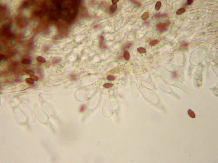 Funddaten: 25.11.2006; Fundort: MTB 7934/4/1/4, 600 m Oberdill, Oberdiller Weg Ost, am Wegrand im Buchenwald, direkt auf in der Streu liegendem morschem Ast (höchstwahrscheinlich Buche); Hut: bis 5,5 cm breit, jung mit spärlichen, weißen, vergänglichen Velumresten, bald verkahlend, rötlichbraun bis schokoladenbraun, stark hygrophan, vom Scheitel her ocker ausblassend, im Zentrum fuchsig bleibend; Stiel: bis 8 cm lang, bis 0,7 cm dick, oft recht kräftig, zur Basis hin schwach verdickt, apikal schwach bereift (alt auch rillig), sonst längsfaserig, weißlich, schmutzigweiß, bisweilen blass hellbräunlich, glänzend; Lamellen: aufsteigend und sehr breit angewachsen, bauchig, dünn, mäßig gedrängt, graubraun, Schneiden gleichfarben, etwas heller flockig; Fleisch: wässerig braun, beim Abtrocknen weißlich; Cheilozystiden: spindelig-bauchig, ca. 28-45 x 10-15, dazwischen keulige Zellen; Pleurozystiden: wie die Cheilos geformt, ca. 43-55 x 13-16; Stielbeflockung: aus polymorphen, zystidenförmigen, rundlichen und keuligen Zellen; HDS: hymeniform; Sporen: elliptisch, mit deutlichem KP, 9,3 x 5,5 (8,5-10,5 x 5-6), Q=1,7;