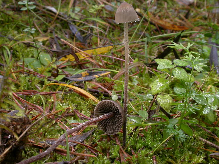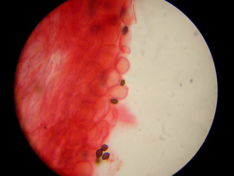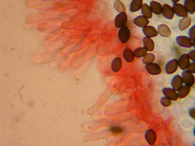 Funddaten: 12./27.10.2006; Fundort: MTB 8034/4/1/4, 600 m; Pupplinger Weiher, nahe am Ufer des 1. Weihers, bei Weiden, jungen Fichten und (weiter entfernt) Kiefer, zwischen Gras, Moos, Schachtelhalm und Schilfstengeln (?); Hut: 4-6 cm breit, jung kegelig, dann schwach gebuckelt, schmierig, +/- glatt, stark hygrophan, schokoladenbaun, am Scheitel rötlichbraun, vom Rand her graubraun bis milchkaffeebraun ausblassend und dadurch am äußeren Drittel auffallend gezont; Hutrand durchscheinend gerieft und mit Guttationströpfchen besetzt; Stiel: bis 12,5 cm lang, schlank, längsfaserig, bisweilen etwas drehwüchsig, an der Spitze cremefarben, dann rötlichbraun, an der Basis dunkel rotbraun bis bis schwarzbraun, auf ganzer Länge grauweißlich bereift und im oberen Drittel mit Wassertröpfchen besetzt; Lamellen: schmal angeheftet, mäßig gedrängt, untermischt, graubraun marmoriert, Schneiden jung schwach hellgrau flockig bis schwach gezähnelt und mit winzigen, unauffälligen Wassertröpfchen besetzt, älter fast glatt und gleichfarben; Fleisch: dünnfleischig, wässerig graubraun; Geruch: unauffällig; Geschmack: mild, unangenehm ranzig; Lamellentrama: -; Basidien: 4-sporig; Cheilozystiden: zylindrisch, wellig, bisweilen schwach kopfig, basal meist verbreitert, ca. 25-40 µm lang, um 5 µm breit, keine Schnallen gefunden; Pleurozystiden: keine festgestellt; Kaulozystiden (Koll2): zylindrisch, zur Basis hin etwas verbreitert, z.B 54 x 10 x 7 (Länge x Bauch x Kopf); HDS: hymeniform, keine PZ gesehen; Sporen: Koll. 1: in H2SO4 nicht entfärbend, elliptisch (Schmalseite) bis zitronenförmig (Breitseite), 8,5-9,5 x 5-6,5 (Breitseite 6-6,5, Schmalseite 5-5,5); Nachmessung am Exsikkat: 9,5 x 6,5 (9-10,5 x 6-7); Q=1,47 (nur die Breitseiten gemessen); Kollektion 2: sehr breit, fast zwiebelförmig, mit KP, 9,4 x 6,9 (8,5-10 x 6,5-7,5), Q=1,37 (1,3-1,6), (am Exsikkat untersucht);