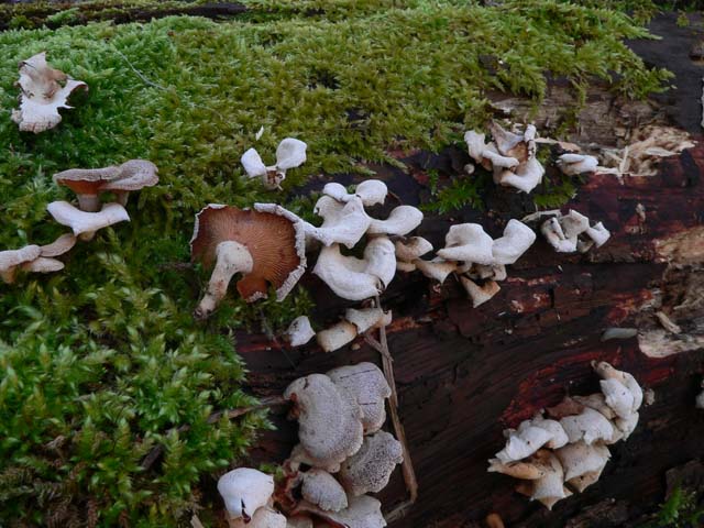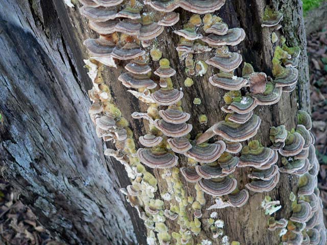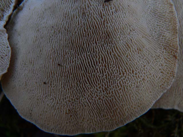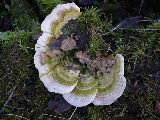 Den würde ich mit Buckeltramete anreden, auch wenn ich im ganzen Wald keine Buche gesehen habe. Was ist das unten aber für ein Blatt?