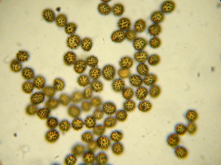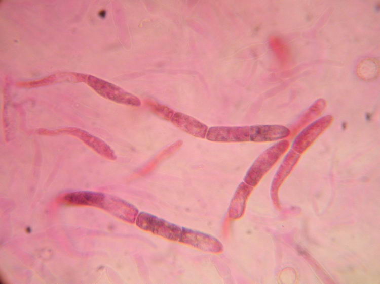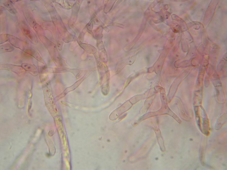 Funddaten: 26.10.2006, MTB 8235/4/2/2, 800 m Marienstein, Schafweide; bei Fichte und Weißtanne; gesellig (3 Fk); Hut: bis 8 cm breit (der Große bis 9), Rand rillig gerieft (der Große nur schwach), glatt (der Große feinsamtig); Stiel: apikal erweitert, Basis verjüngt, längsrillig bis grob längsfurchig, wattig ausgestopft, weiß, alt grauend oder bräunend; Lamellen: mit "Schweißnaht" angewachsen, cremefarben mit buttergelbem Reflex, alt orangegelb; Fleisch: weiß, im Schnitt schwach gilbend; Geruch: angenehmst und intensiv obstartig (Birne!); Geschmack: Hutfleisch sehr scharf, bald brennend, Lamellen genauso; HDS: PZ zylindrisch bis schlankkeulig, sehr vereinzelt mit Divertikeln, ca. 50-110 lang, 5-8 breit, meist mehrfach septiert (1-4fach), Endstücke ca. 12-50 µm lang; Haare polymorph, ca. 2-5 µm breit, oft wellig bis knorrig, verzweigt, schwach divertikuliert, mit körnigen, punktförmigen Inkrustationen (?), verschieden eng septiert; Sporen: rundelliptisch, 10,2 x 8,3 (9-11,5 x 7,5-9), Q=1,23 (1,1-1,3); Ornamentierung: isoliert stachelig, ohne Verbindungen, Stacheln meist dicht stehend, 0,8-1,8 µm hoch, Plage amyloid; Sporenpulver: IVc (gelb)