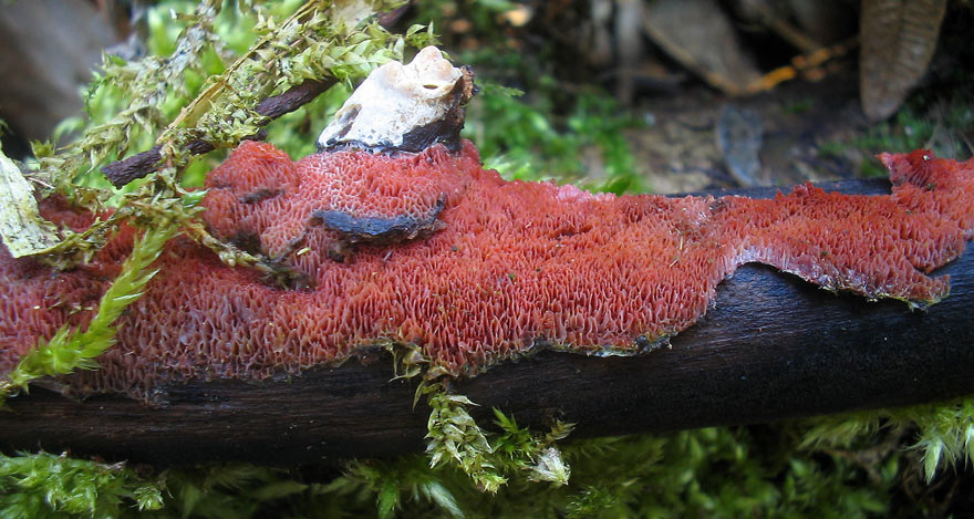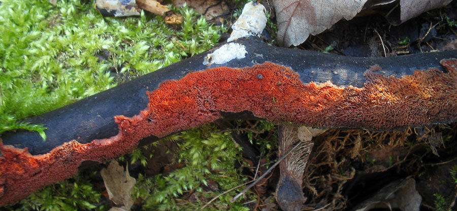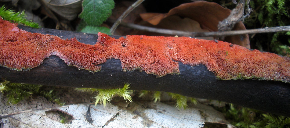 ich war heute mal nach dem Bärlauch schauen, da ist mir an einem Ast eines Laubbaumes (Linde, Ahorn oder Esche) folgender roter Pilz aufgefallen: