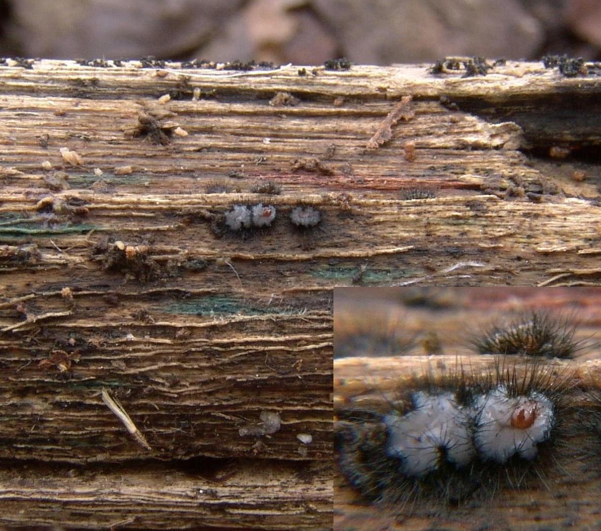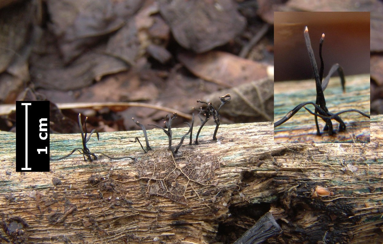 zum anderen habe ich, zumindest meiner vermutung nach, eine xylaria-art gefunden. sie ist 0,8 cm hoch und etwa 0,5 mm dick. könnte es sich hierbei um xylaria filiformis handeln, auch wenn sie auf laubholz wächst? beim mikroskopieren kam im übrigen nichts heraus, da es wohl noch das konidienstadium ist.