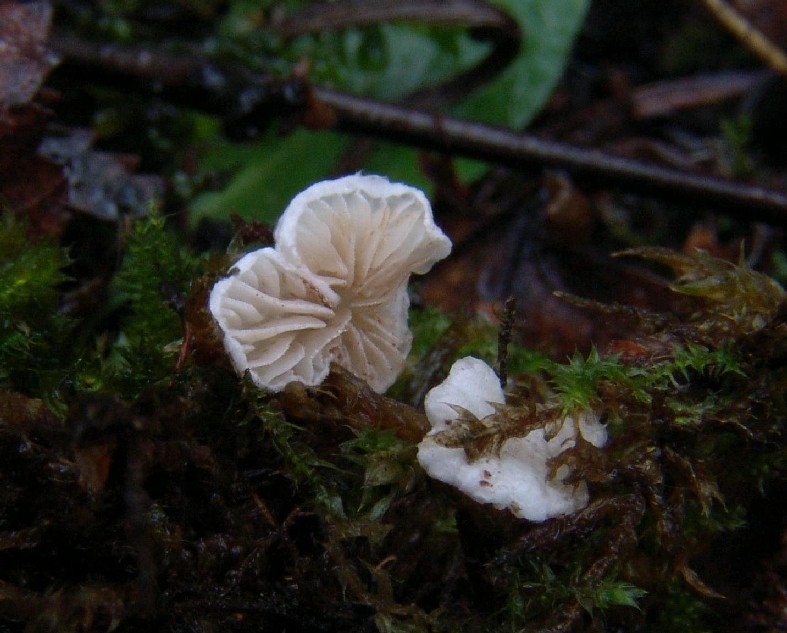 Also, der 1. Fund ist mit großer Wahrscheinlichkeit eine Crepidotus-Art. Naja, das wäre ja nichts besonders Aufregendes und eigentlich nur für Mikroskopiker interessant, wenn der Pilz nicht an Moos gewachsen wäre (s. Foto). Ich hatte zunächst versucht, den Pilz mit dem Crepidotus-Schlüssel in Pilze Baden-Württembergs zu knacken. Da bin ich dann aber bei Crepidotus cesatii gelandet, was aber irgendwie nicht stimmen konnte.