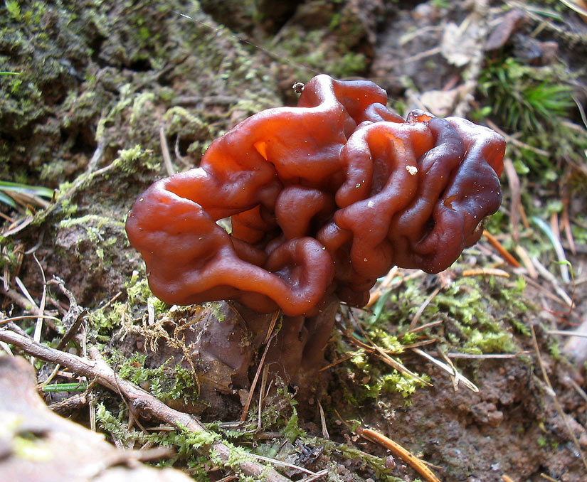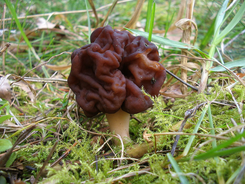 Sie schieben sich dort sehr zahlreich aus dem Boden. Unter der selben Hecke fand Werner einen kleinen Bercherling auf den Samen/Früchten von Weißdorn. (Leider ohne Bild) Auf der Hinfahrt hielt ich mit Jenny kurz an einem Wald mit Kiefern auf Sand: Frühjahrslorchel: