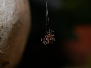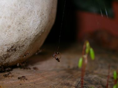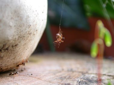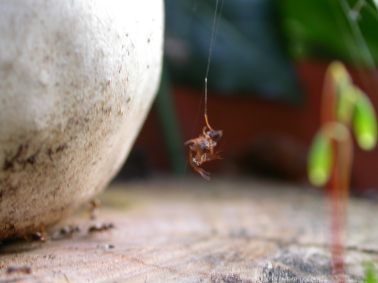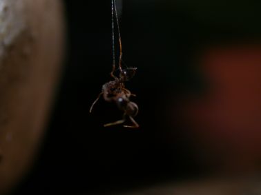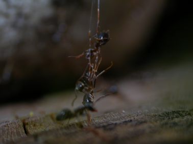 eine Ameise in einem Spinnfaden verheddert. Interessant fand ich, dass ihr eine andere Ameise helfen wollte,