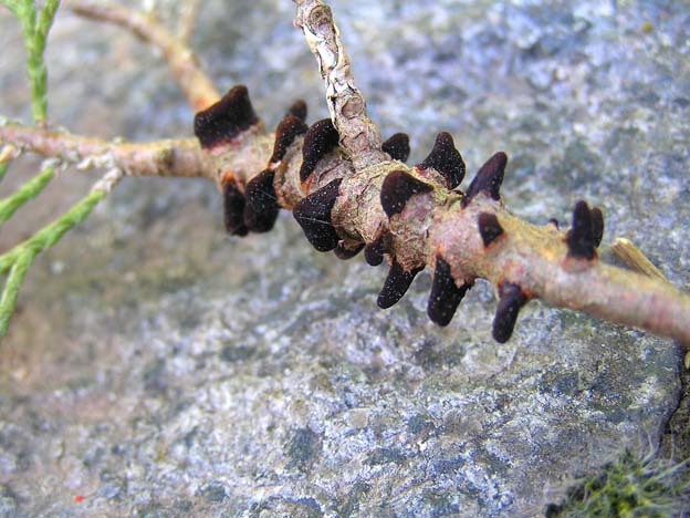 An meinem Vorgarten-Wacholder (Juniperus... genauen botanischen Namen weiß ich nicht) beobachte ich schon seit einigen Tagen seltsame braune Auswüchse an einigen Ästen. Zuerst dachte ich, es ist vielleicht von Insekten verursacht. Vielleicht ist es aber auch ein Pilz.