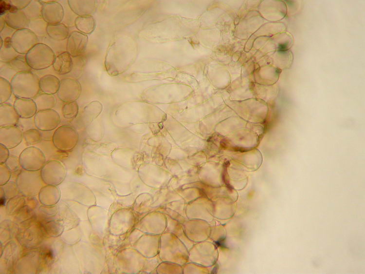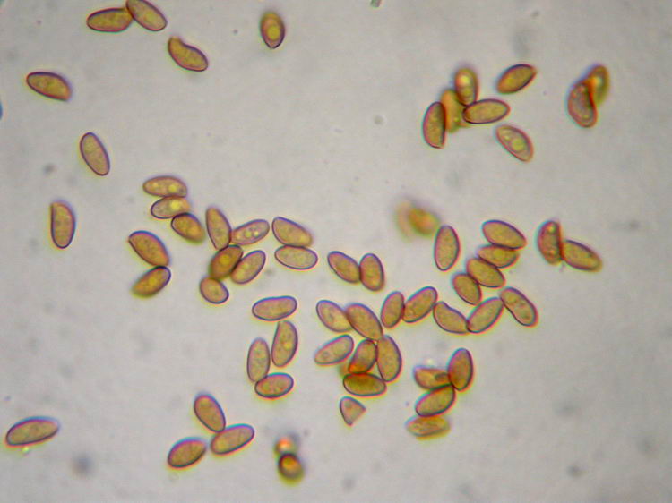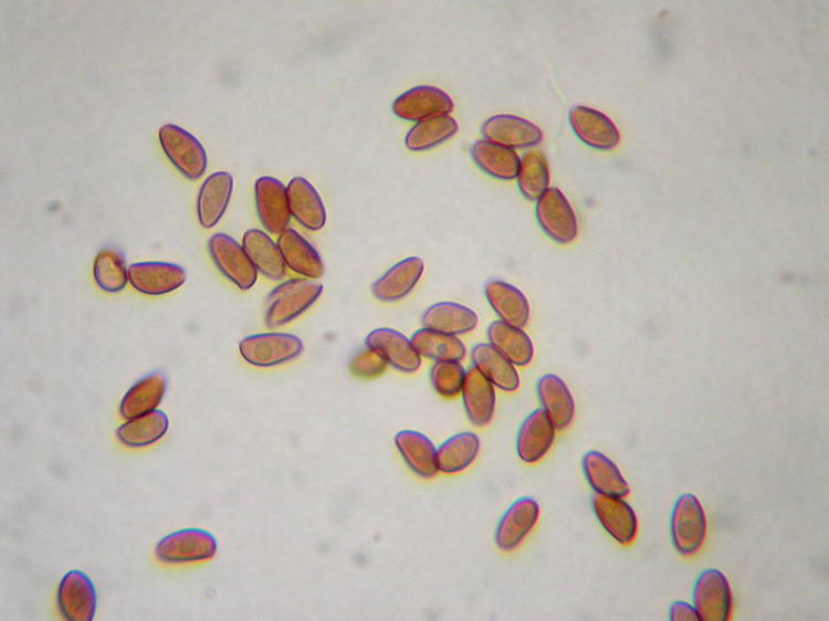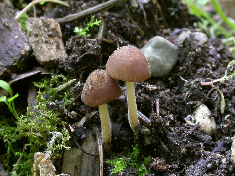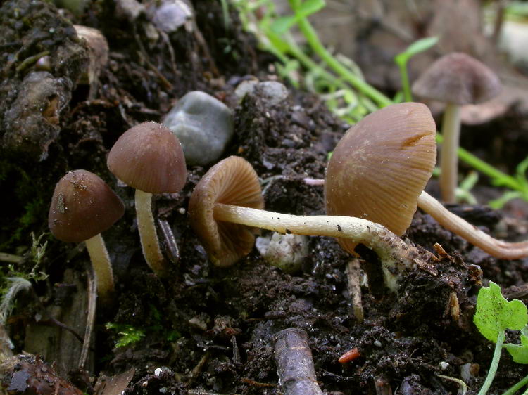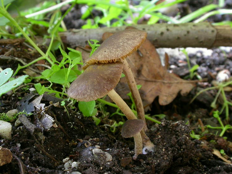 Funddaten: 20.05.2007; MTB 7934/4/1/3, 620 m; Forstenrieder Wald; Ruderalstelle mit Holzhäcksel und -stückchen, vermischt mit Humus; nicht direkt auf, aber in Verbindung mit Holzresten; gesellig (ca. 20 Fk) bis angedeutet büschelig (nicht direkt verwachsen, aber direkt aneinander); Hut: ca. 1,5-3 cm breit, jung kegelig bis glockig, später konvex bis ausgebreitet, kaum bis schwach stumpf gebuckelt; Oberfläche glatt bis etwas runzelig, jung dunkelbraun, später graubraun bis ockerbraun, bisweilen zu 2/3 durchscheinend gerieft, bisweilen nur ganz am Rand, beim Abtrocknen hell graubraun und auffallend räudig-fleckig ausblassend (ähnlich wie Strobilurus esculentus), hygrophan;; Stiel: ca. 2,5 - 4,5 cm lang, zylindrisch, hohl, dünn, blass ockerbraun bis ockergelblich, fein längsrillig und auf ganzer Länge fein silbriggrau bereift (vergänglich); Basis bisweilen gekniet und etwas keulig verdickt; Lamellen: aufsteigend angewachsen, gedrängt, jung grauweiß mit schwach bräunlich gefärbter Schneide, später gelbbraun;; Fleisch: sehr dünnfleischig, weißlich bis wässerig graubraun; ; Geruch: unauffällig;; Geschmack: mild, uncharakteristisch;; Lamellentrama: -; Basidien: 4-sporig; Cheilozystiden: typisch lecithyform mit kurzem Hals, dicht an dicht, gut sichtbar, ca. 20-25 x 7-9 x 4-5,5 (Länge x Bauch x Kopf); Pleurozystiden: keine; Kaulozystiden: überwiegend lecithyform wie die Cheilos, z. B. 25 x 8,5 x 5,5; 28 x 15 x 7, Schnallen vorhanden, Endzellen der Stielbereifung bisweilen auch keulig bis blasig, büschelig; keine Haare; HDS: Hymeniderm aus birnenförmigen, oft lang"gestielten" Zellen, ca. 30-60 x 12-20; keine Pileozystiden, keine Haare in der HDS; Sporen: dickwandig, elliptisch bis schwach bohnenförmig (suprah. Depr.), in Wasser blass ockerbräunlich, in KOH rötlichbraun bis orangebraun, Keimporus unauffällig, meist kaum wahrnehmbar, eher Kallus, 7,5 x 4,3 (7-8 x 4-4,5), Q=1,74 (1,6-1,9); Messung an 2. Fk: 7,25 x 4 (7-8 x 3,5-4,5), Q=1,81 (1,6-2,0); jeweils 10 Sp. gemessen;