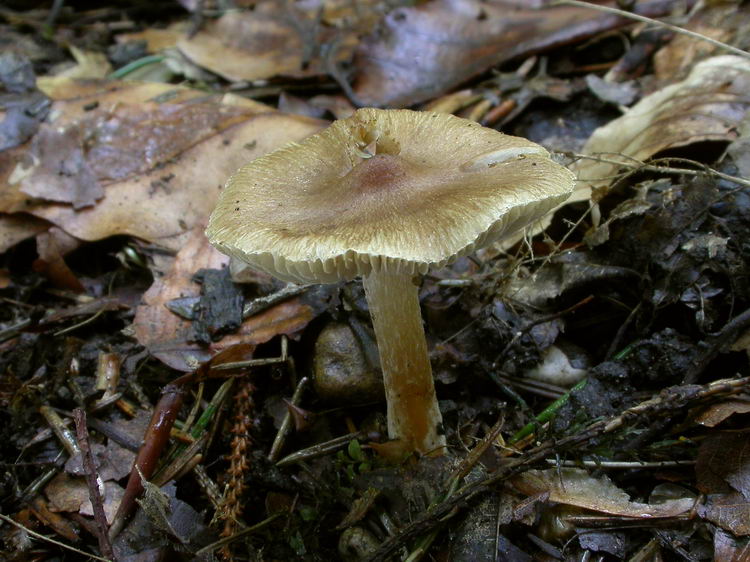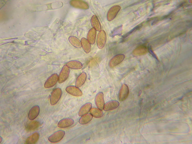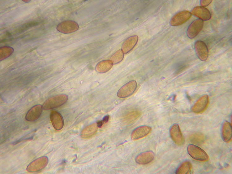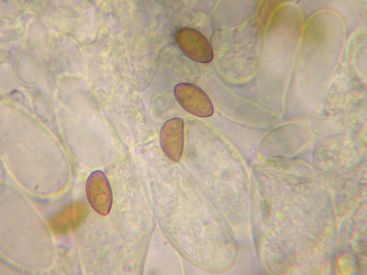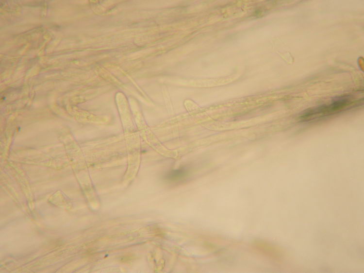 Funddaten: 09.06.2007; 8036/4/4/4, 600 m, Westerham, am Wegrand bei Fichte, Eiche, Hainbuche und Erle; einzeln; Hut: 3,2 cm breit, spitz gebuckelt, Oberfläche faserig, am Hutrand grobfaserig aufreißend, haselnussbraun, am Scheitel dunkler rötlichbraun, zum Rand hin heller wirkend; Stiel: 4 cm lang, bis 0,5 cm breit, zylindrisch, blass holzfarben (cremebeige), nur an der Spitze feinst weißlich bereift, sonst glatt und weißlich überfasert, Basis schwach verdickt und weißfilzig; Lamellen: ausgebuchtet angewachsen, bauchig, graubraun mit deutlichem Olivton, Schneiden weißflockig; Fleisch: dünnfleischig, im Hut weiß, im Stiel blass holzfarben; Geruch: intensiv nach Paprikachips (spermatisch); Geschmack: -; Lamellentrama: regulär, Zellen spindelig aufgeblasen;; Basidien: 4-sporig, 30-38 x 8-11, mit Basalschnallen; Cheilozystiden: metuloid, spindelig, ca. 60-65 x 15-18, Wandstärke am Bauch 1-1,5, am Kopf 1,5-3, dazw. zahlreiche keulig-blasige Zellen, Schnallen vorhanden; Pleurozystiden: z.B. 68-84 x 14-16, Form und Wandstärke wie die Cheilos; Kaulozystiden: nur im oberen Stielbereich echte, metuloide Kaulos, ca. 48-73 x 14-16, Wandstärke 0,5-1, vermischt mit keulig-blasigen Zellen; Endzellen der Stielbefaserung knapp unter der Stielmitte zylindrisch mit abgerundeten Enden, z.B. 57x10, 65x10; HDS: -; Sporen: mandelförmig, 10,9 x 5,8 (9,5-12,5 x 5-6,5), Q=1,88 (1,7-2,1), 20 Sp. gemessen;